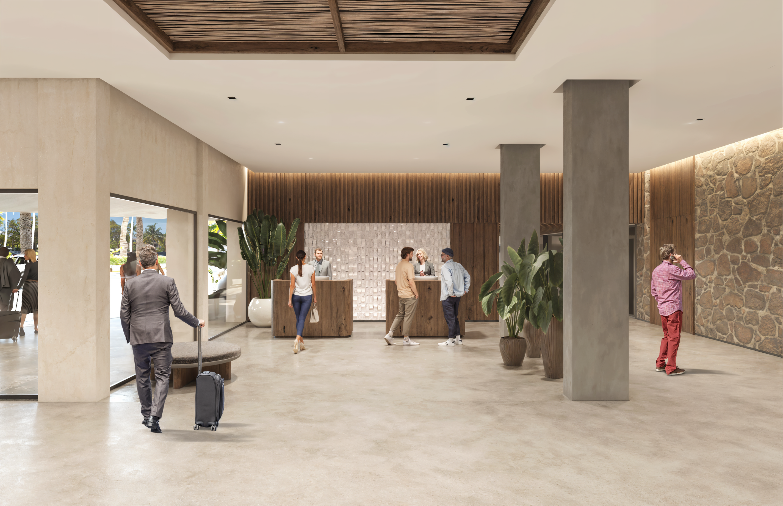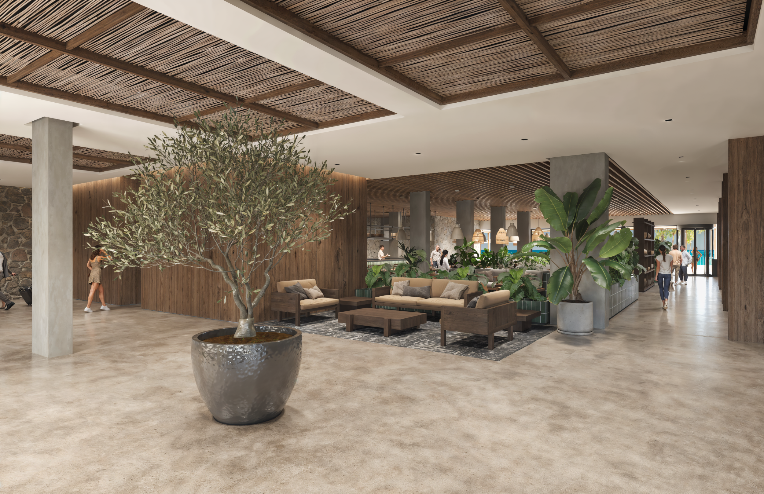 The lobby and reception areas are completely reimagined as a relaxed yet refined social hub. Sculptural reception desks, textured wall surfaces, and curated lighting create a warm, tactile environment. Indoor planting and visual connections to exterior terraces blur the boundary between inside and out, reinforcing the resort atmosphere from the moment guests arrive.