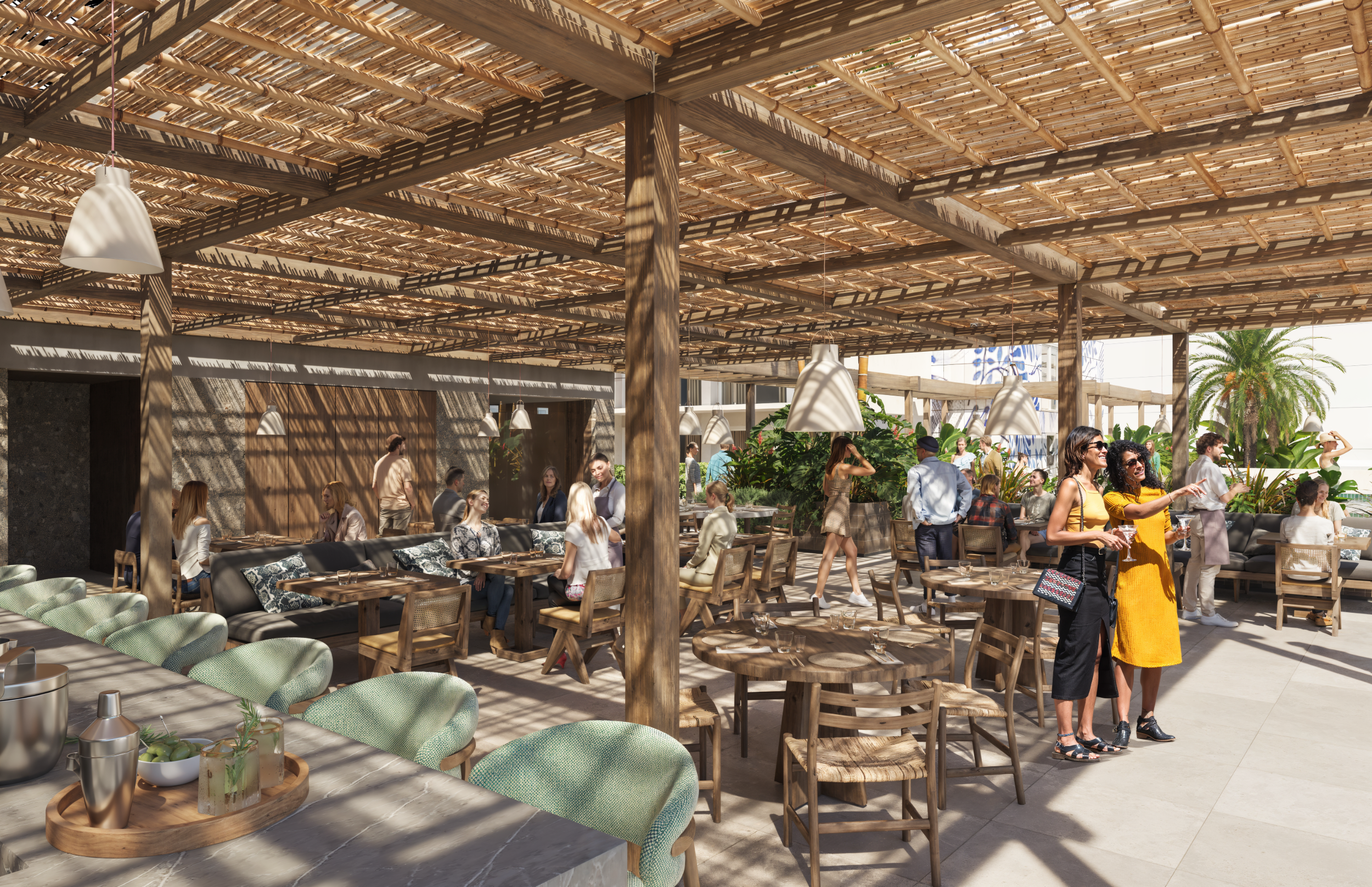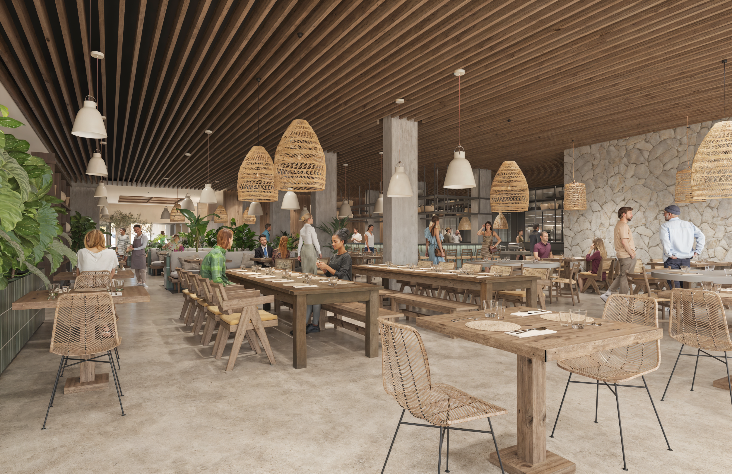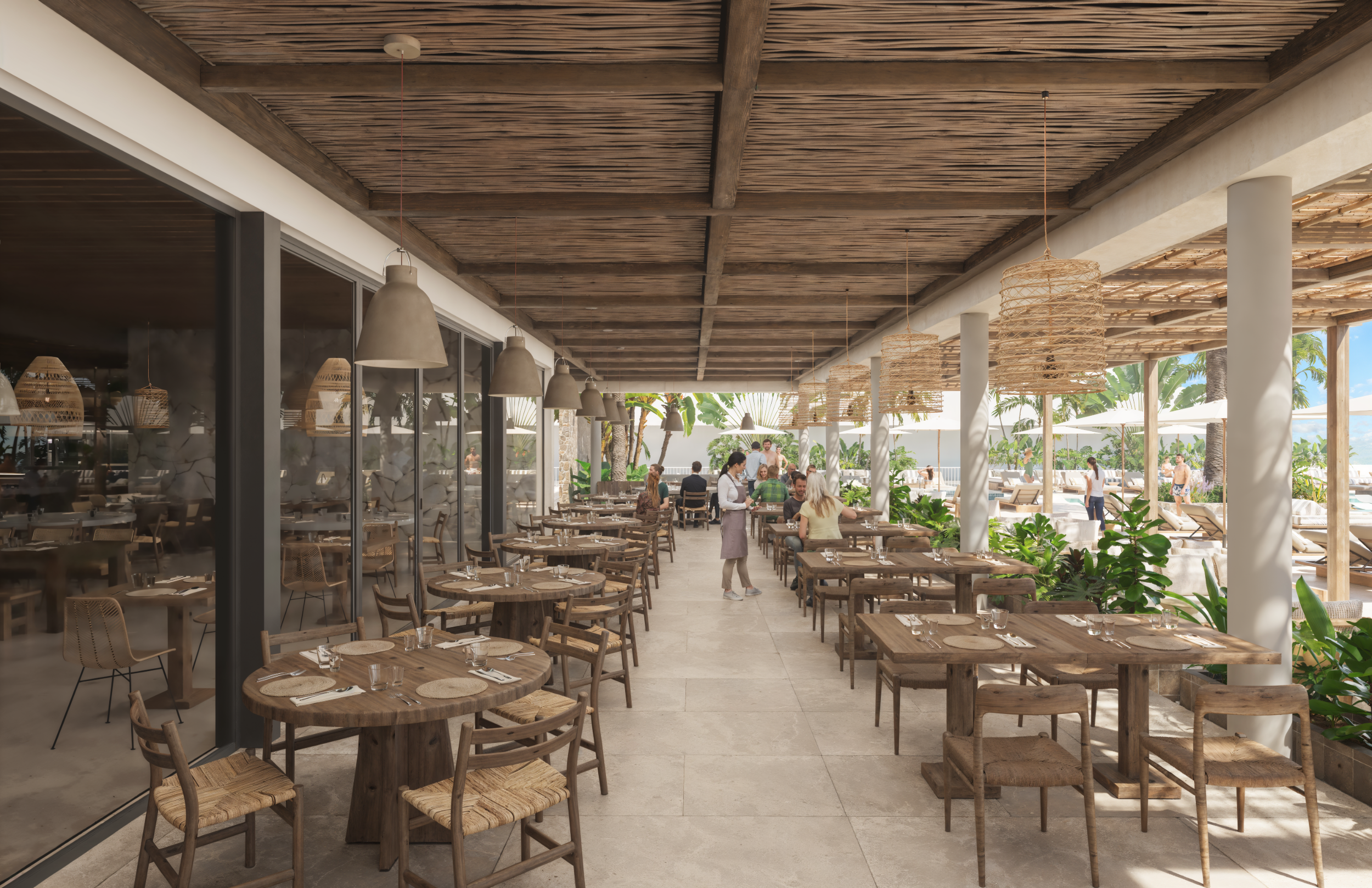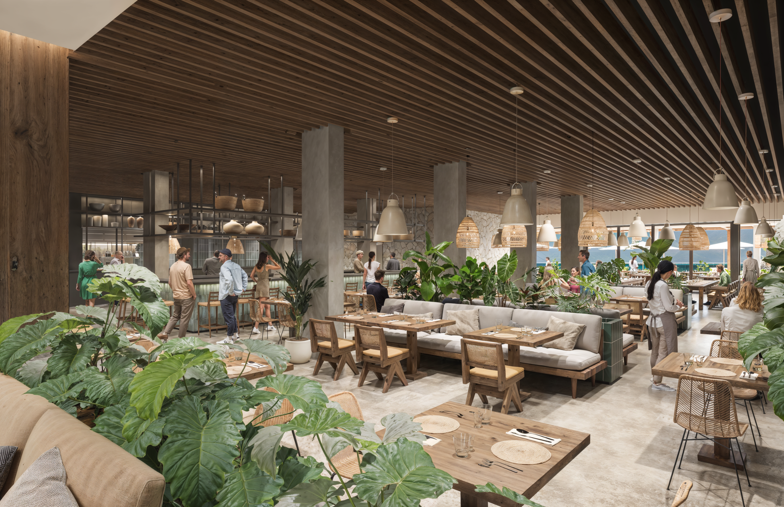 The Main Restaurant & Bar is designed as an open, inviting space with layered seating options, natural materials, and visual transparency to the adjacent outdoor terraces.